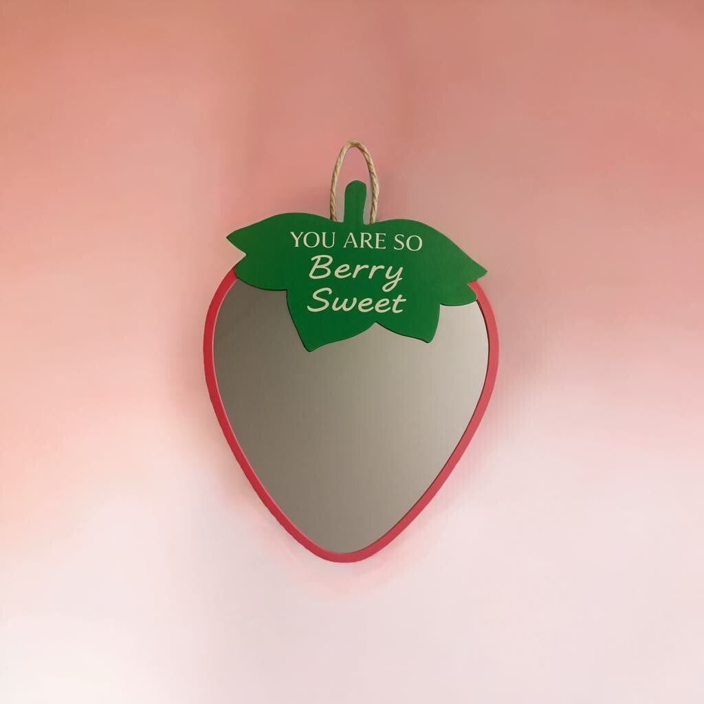 Strawberry-shaped wall hanging mirror, engraved with “You Are Berry Sweet.”